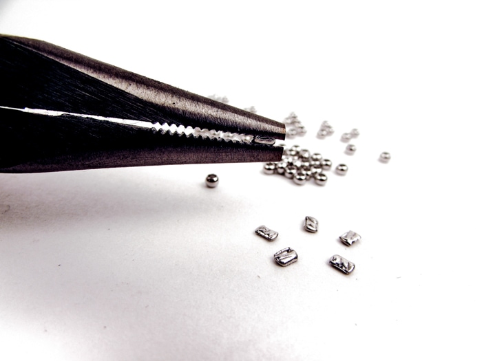 Thread crimp onto string, then squeeze ends together with jewelry pliers, to prevent other beads from shifting. 500 per package.