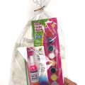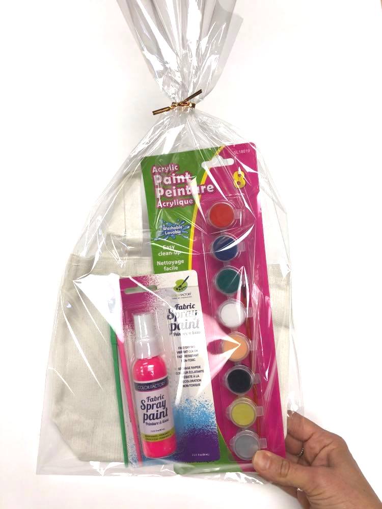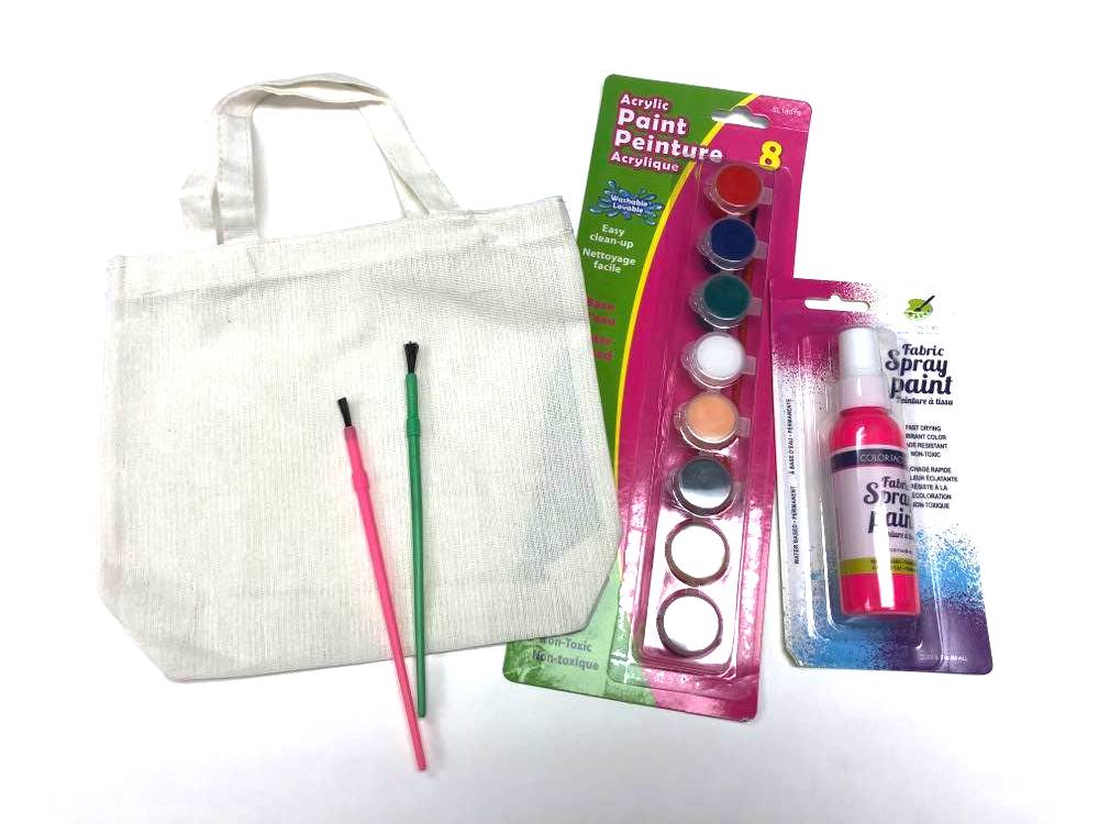 Canvas Bag Kit contains: 1 Large Canvas Bag, 1 paint pot set, 2 Fine Brushes, 1 Fabric Paint