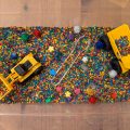 Inside your bin you will find: 2 cookie cutters, coloured rice, glass stones, glitter pom poms, 2 trucks, mini mesh strainer & mini tongs