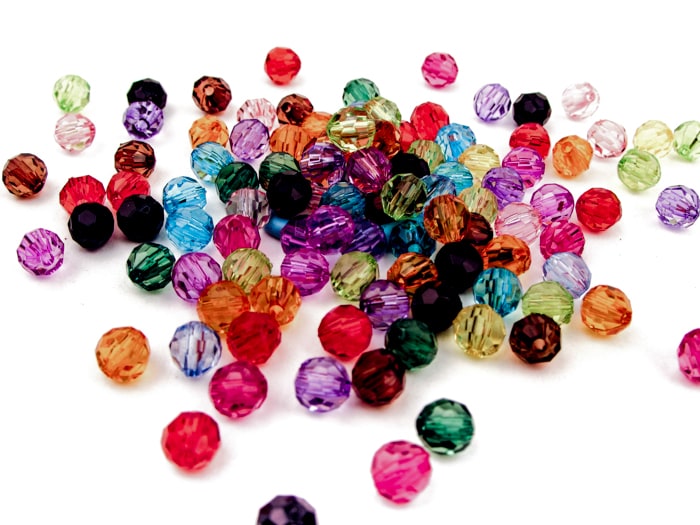 8 mm round, faceted, plastic beads in assorted transparent colours. 500 per pack. Can be used with fishing wire or stretch cord.