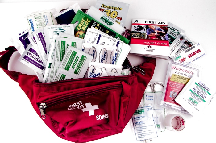 Fanny pack includes: rescue blanket, insect repellent, bite treatment, waterless hand cleaner, burn care, sunscreen, assorted bandages and dressings, scissors, tweezers and 1 manual. Sold as full or empty fanny pack which can be filled with various items.