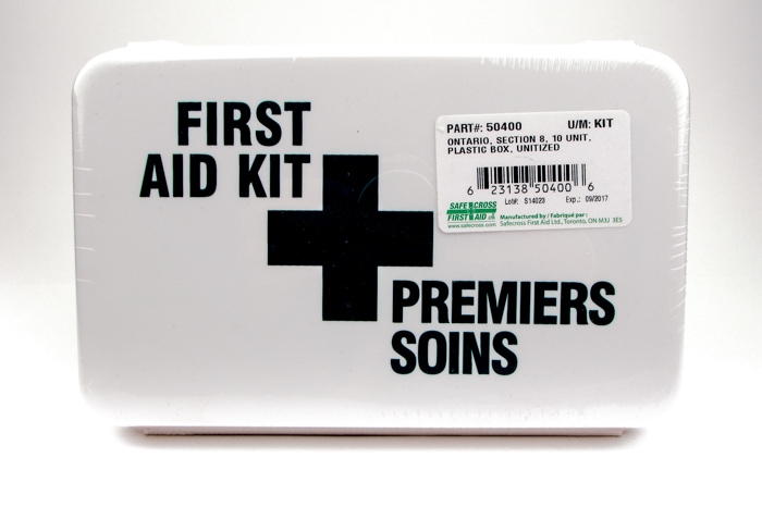 Kit includes first aid manual, compress bandage, gauze rolls, gauze pads, plastic bandages, safety pins, triangular bandage. Small kit: 10 items, 1-5 people. Large kit: 16 items, 6-15 people.