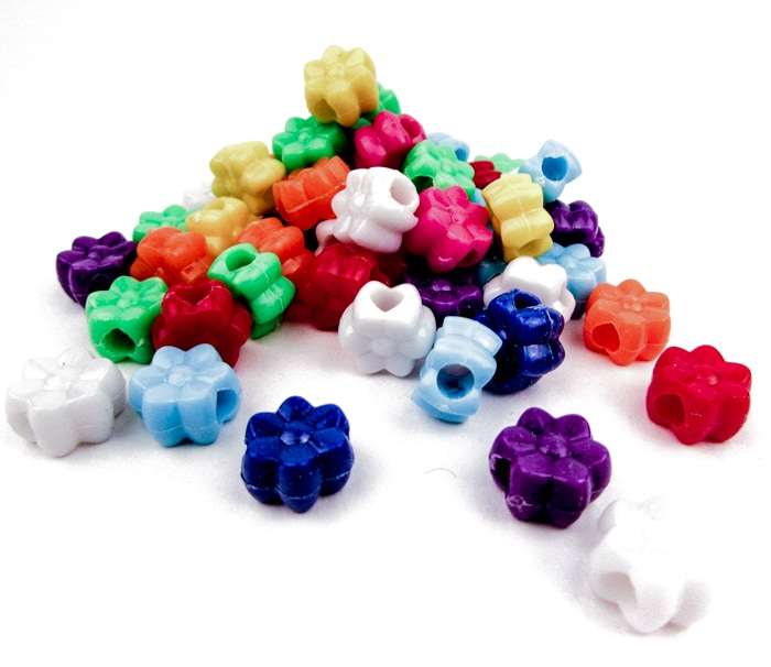 These colourful, plastic beads can be used with plastic lacing, pipe cleaners, fishing wire or stretch cord.