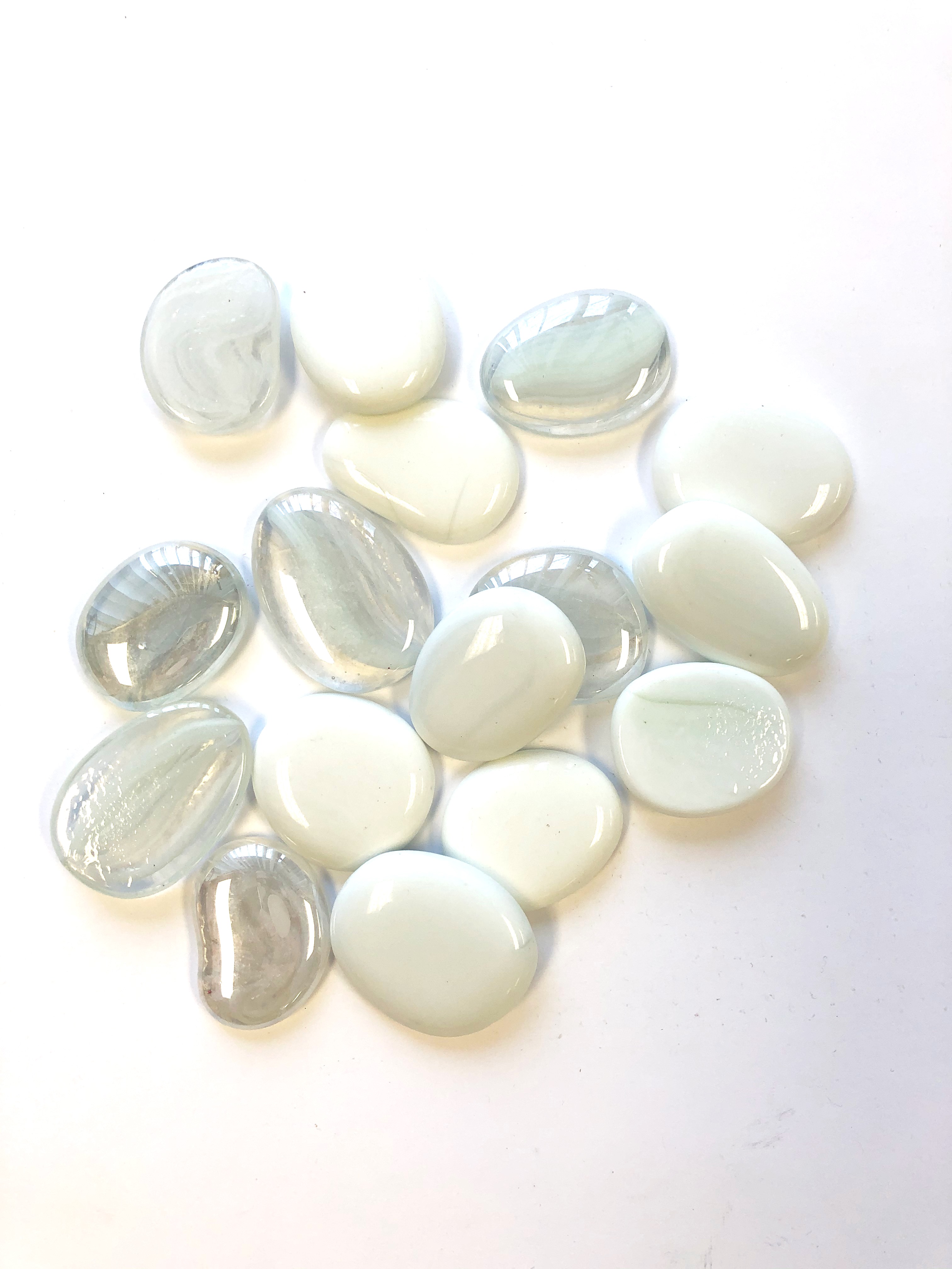 Smooth-surfaced glass stones in 4 transparent colours & 1 large. Use with glue for collages or add to clay projects for an interesting effect. 72 per package