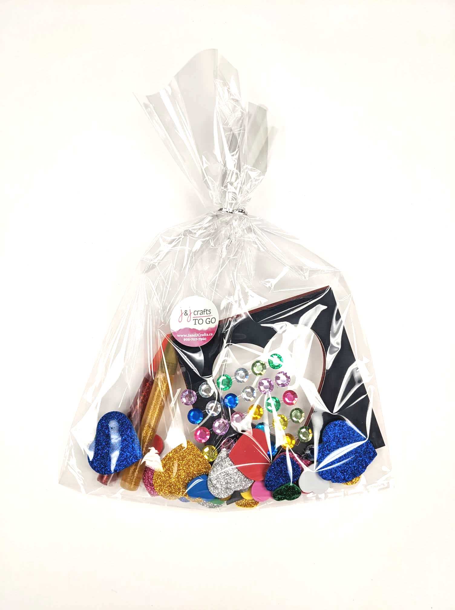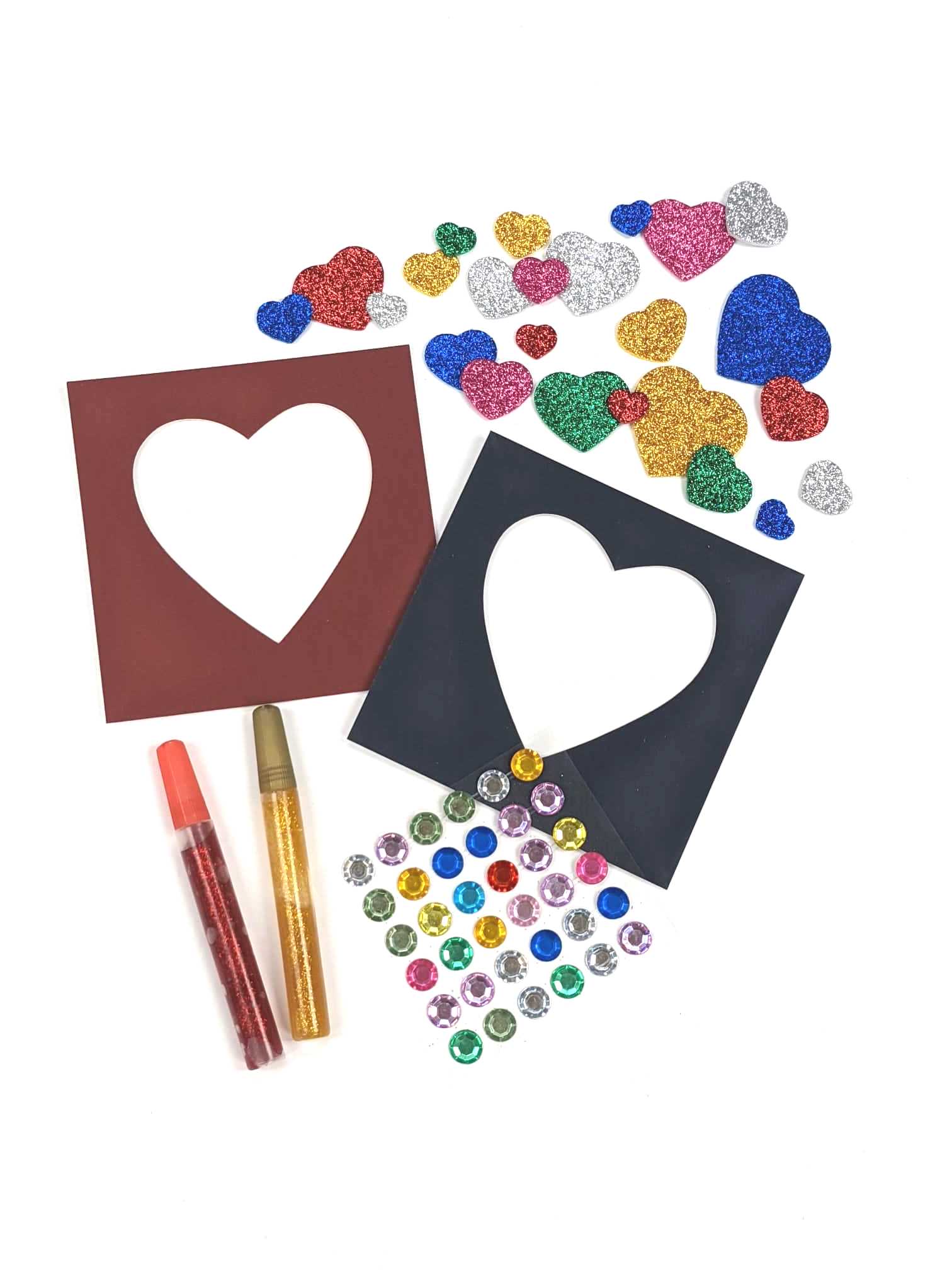 Kit contents: 2 cardboard heart picture frames, peel n’ stick jewels, 2 glitter glue, foamie glitter hearts!