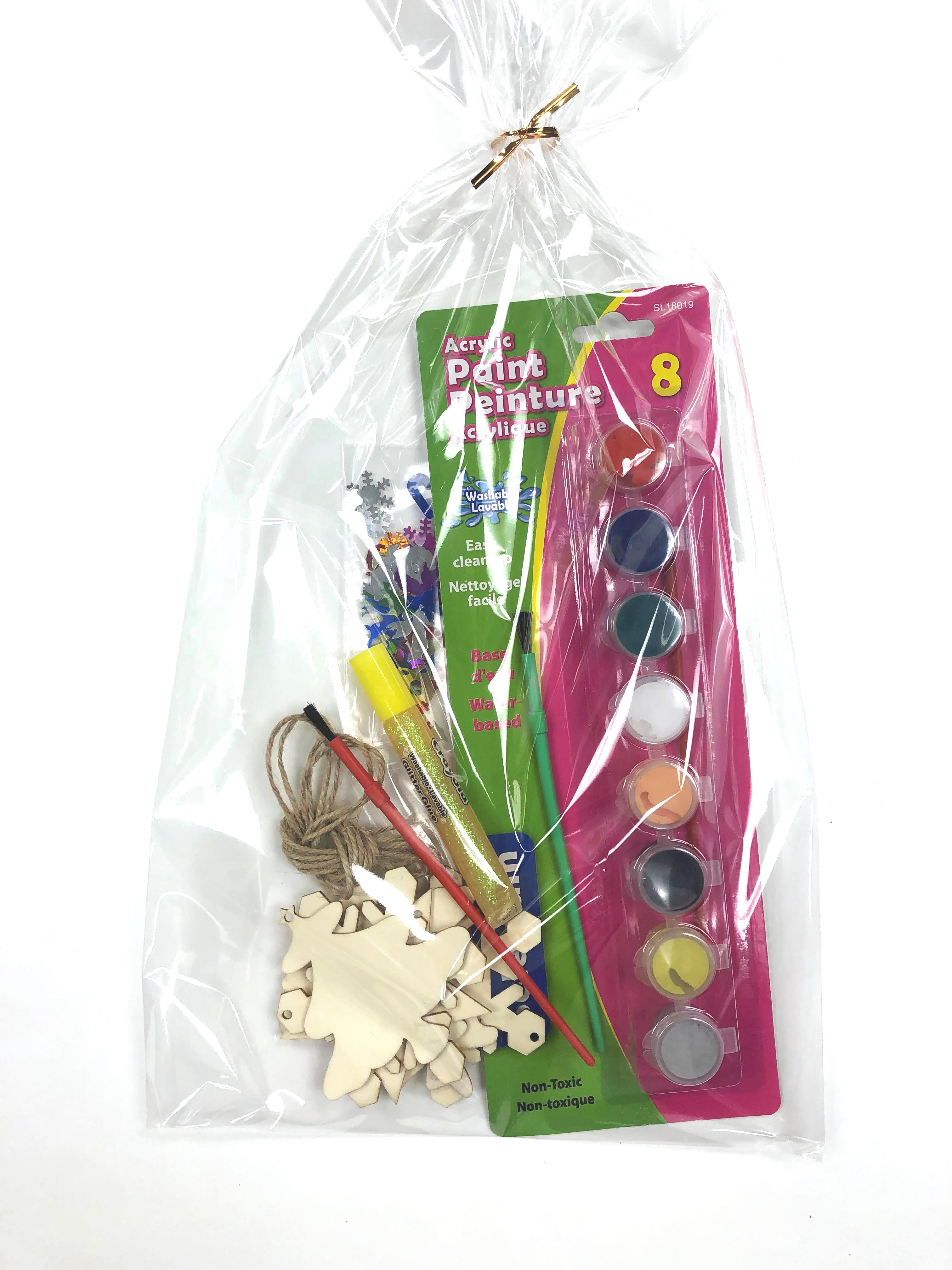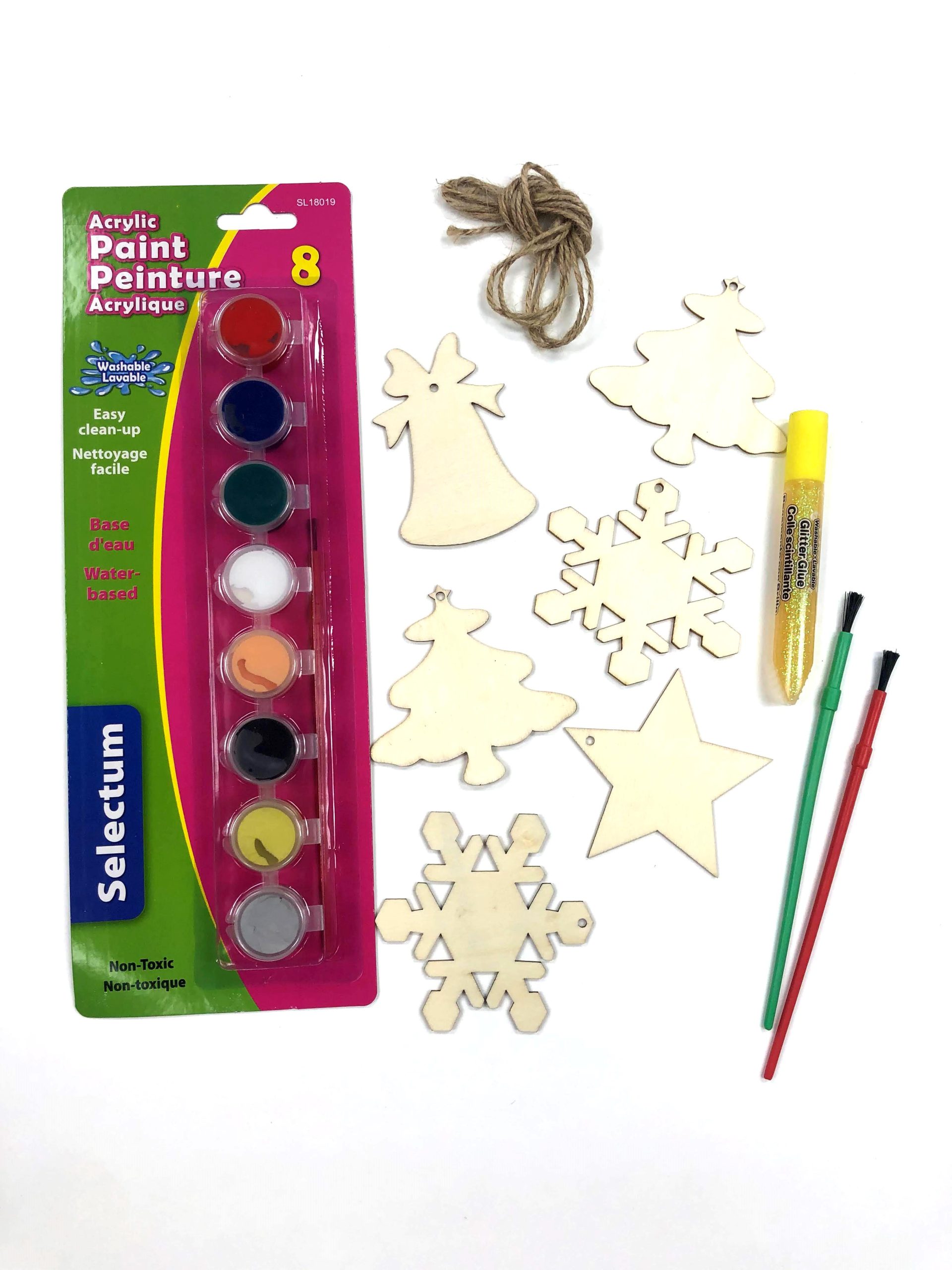 Paintable Wood Ornament Kit contains – sheet of 6 wooden ornaments, acrylic paint pot set, 2 fine brushes and 3 glitter glue!