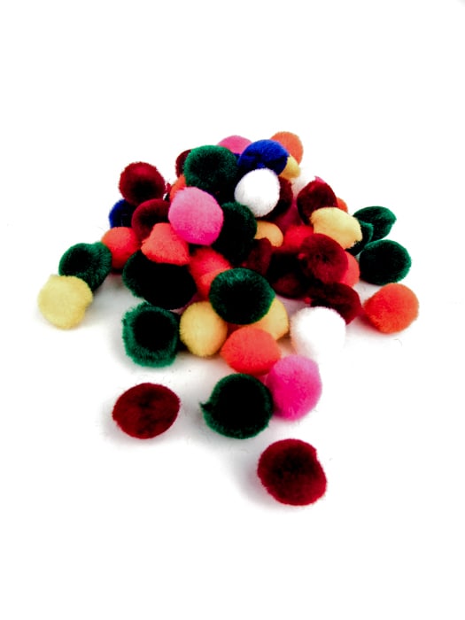 An assortment of sizes and colours of this popular craft item. Sold in 3 convenient sizes: 100 per pack and an assorted-sized pack: 200 per pack. Glitter coloured pom-poms are sold in ½”. 100 per pack.