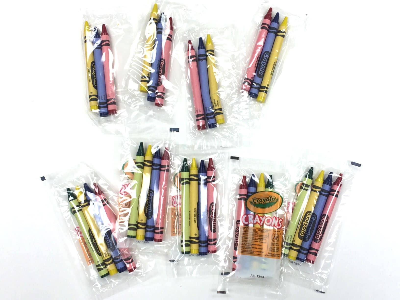 Cello wrapped crayola crayons sold by the case (360 packages) in 3 pack of red, yellow, blue or 4 pack of red, yellow, blue, green per package.