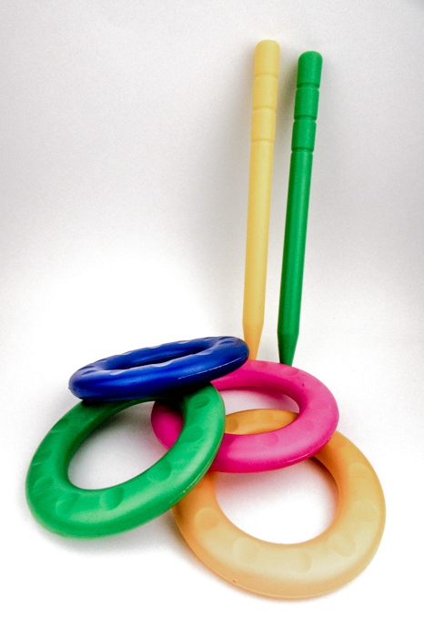 4 plastic, colourful rings and 2 plastic sticks. For outdoor play.