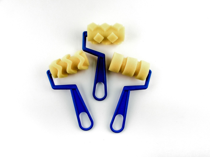 Plain or assorted shaped soft foam rollers with a plastic handle. Creates fun designs with tempera or acrylic paints.