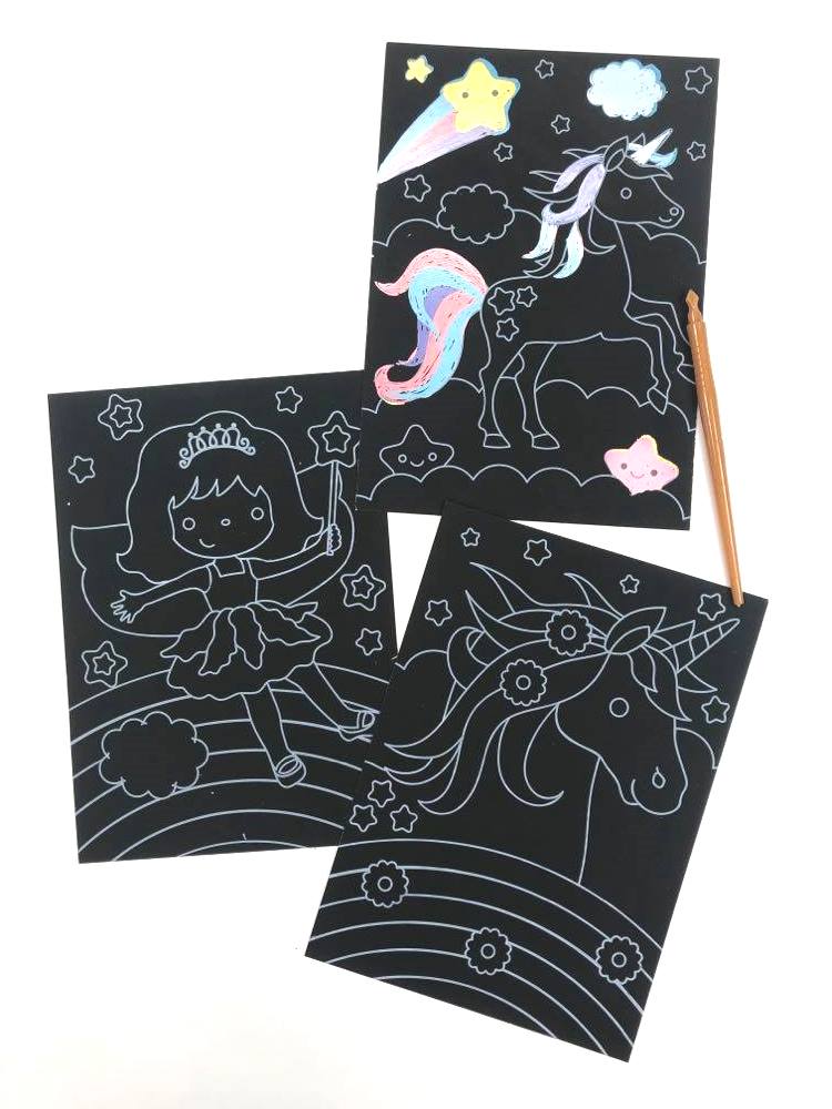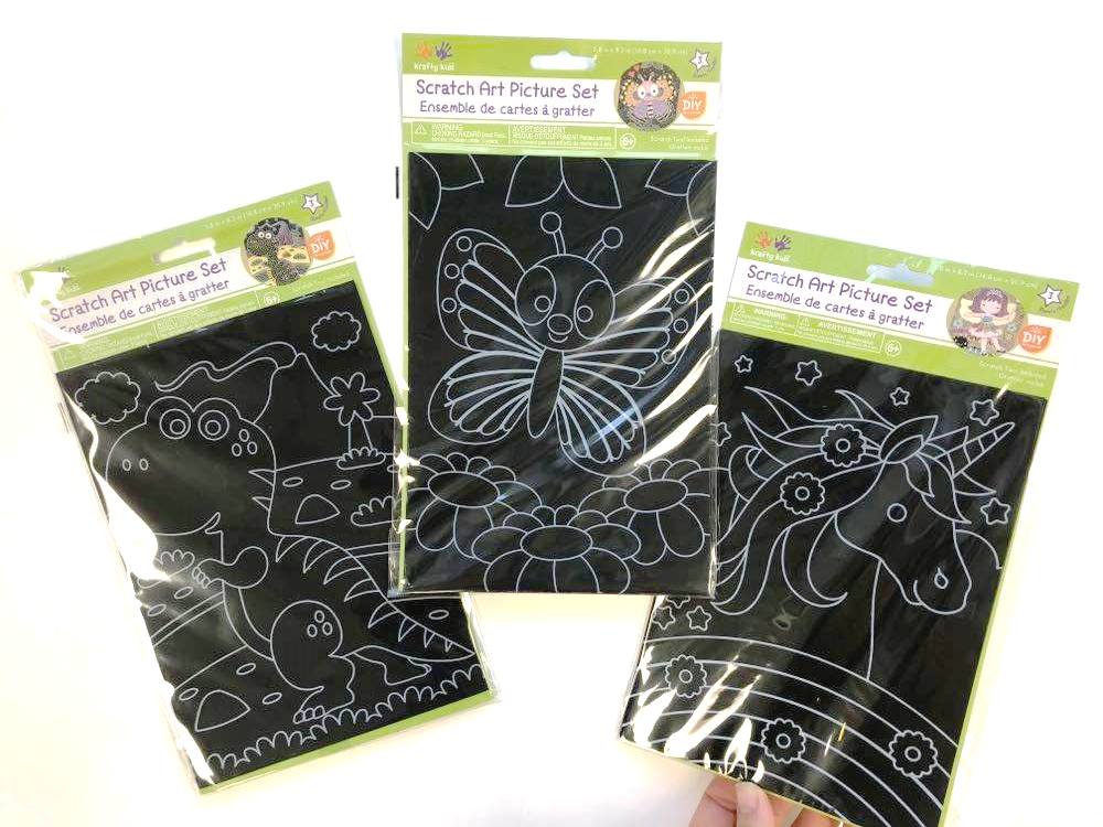 Each kit comes with 3 sheets (5.8″ x 8.2″) and a scratcher. This is an easy and fun craft for everyone!