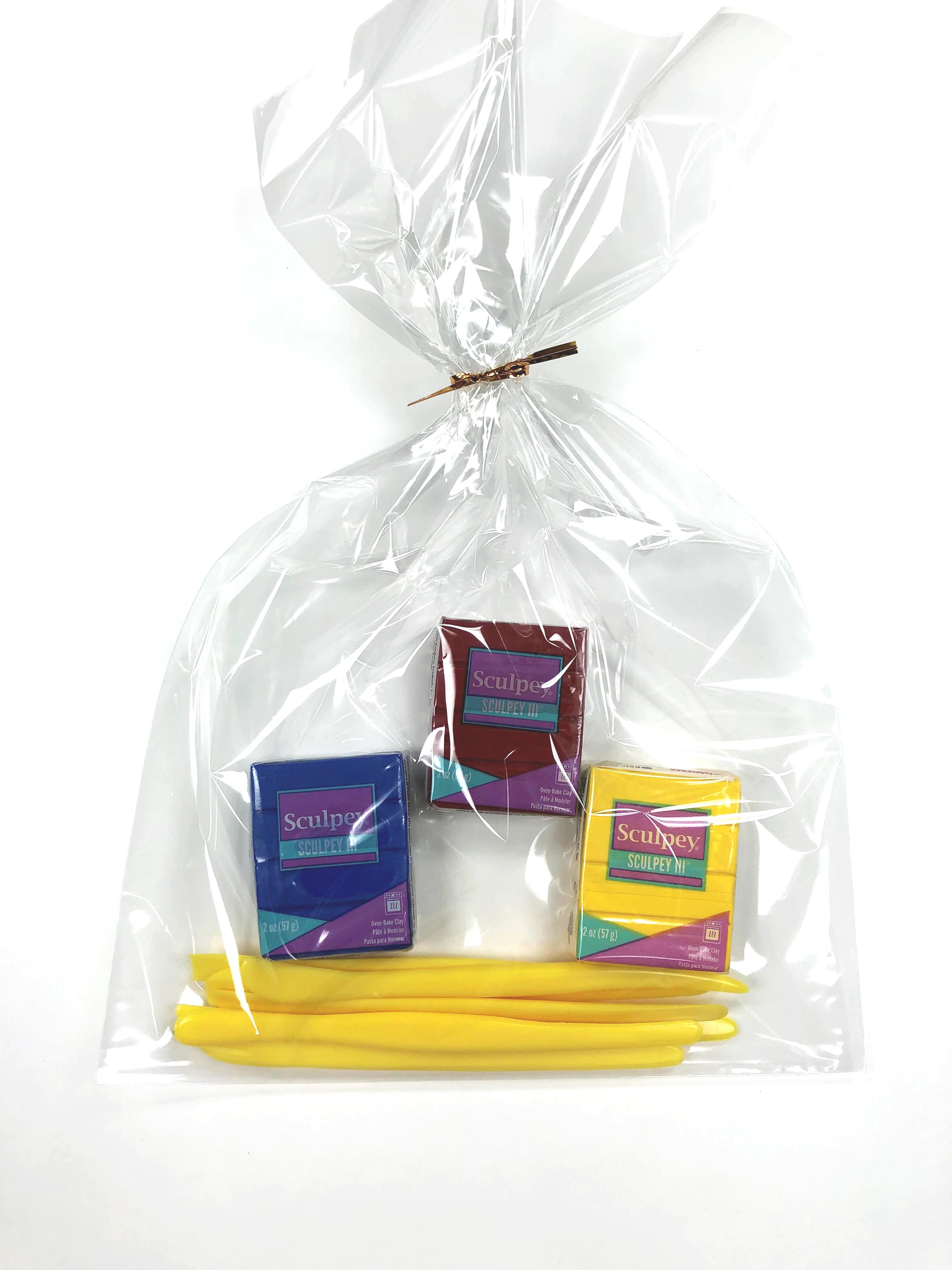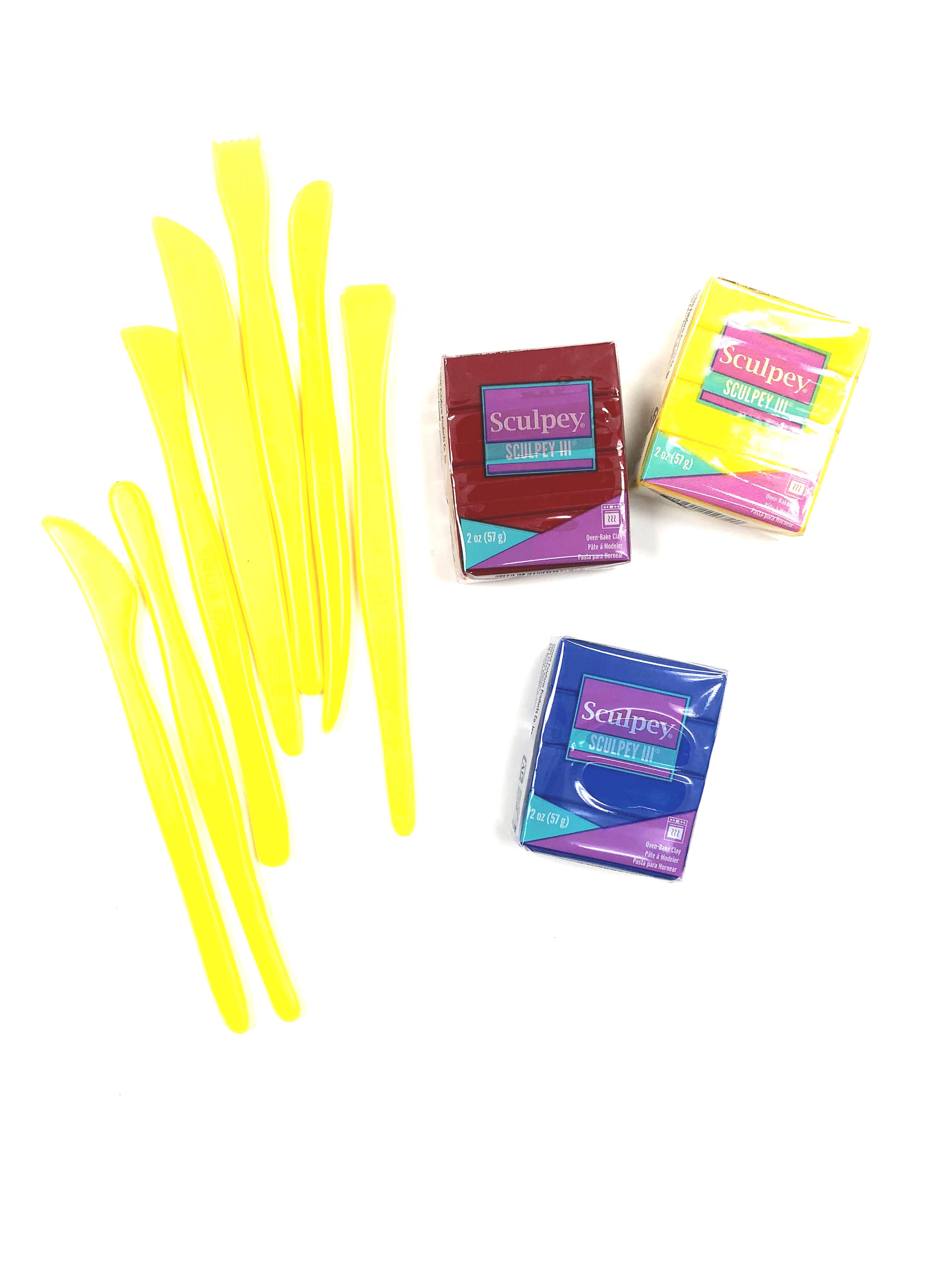 Sculepy Kit contains – 3 colours of sculpey & sculpting tools (baking instructions on package)