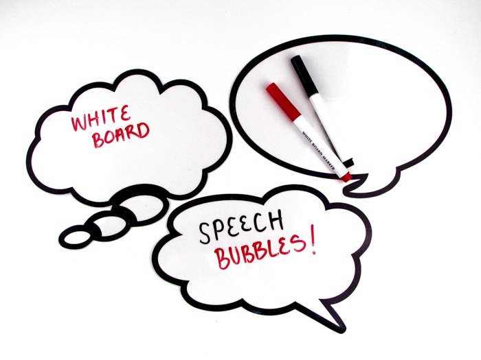 12 assorted shaped “bubbles”, made from heavy, laminated cardstock. For use with white board markers and erasers. Markers sold separately.
