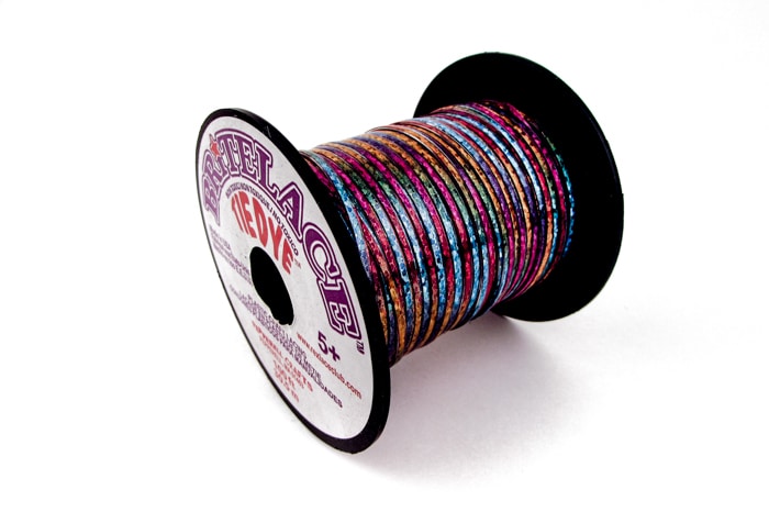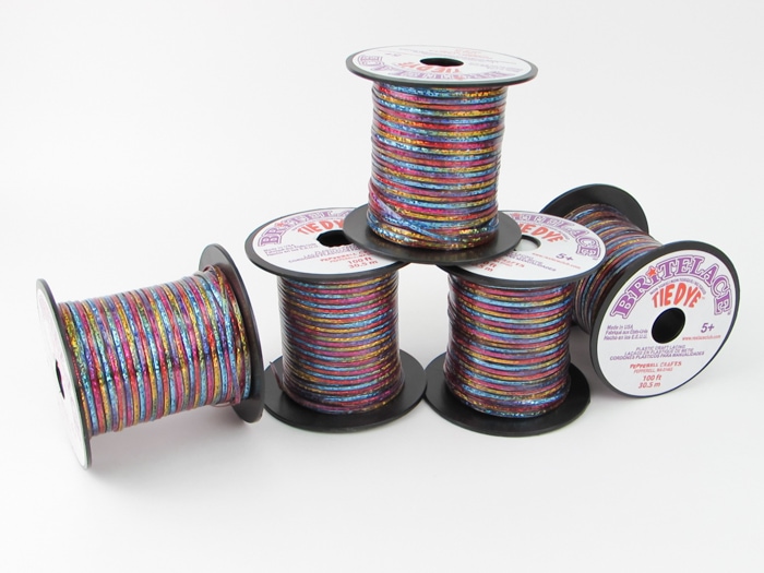 Multi coloured or ‘tie dye’ plastic lacing adds an interesting affect to all your lacing projects! 33yds per spool