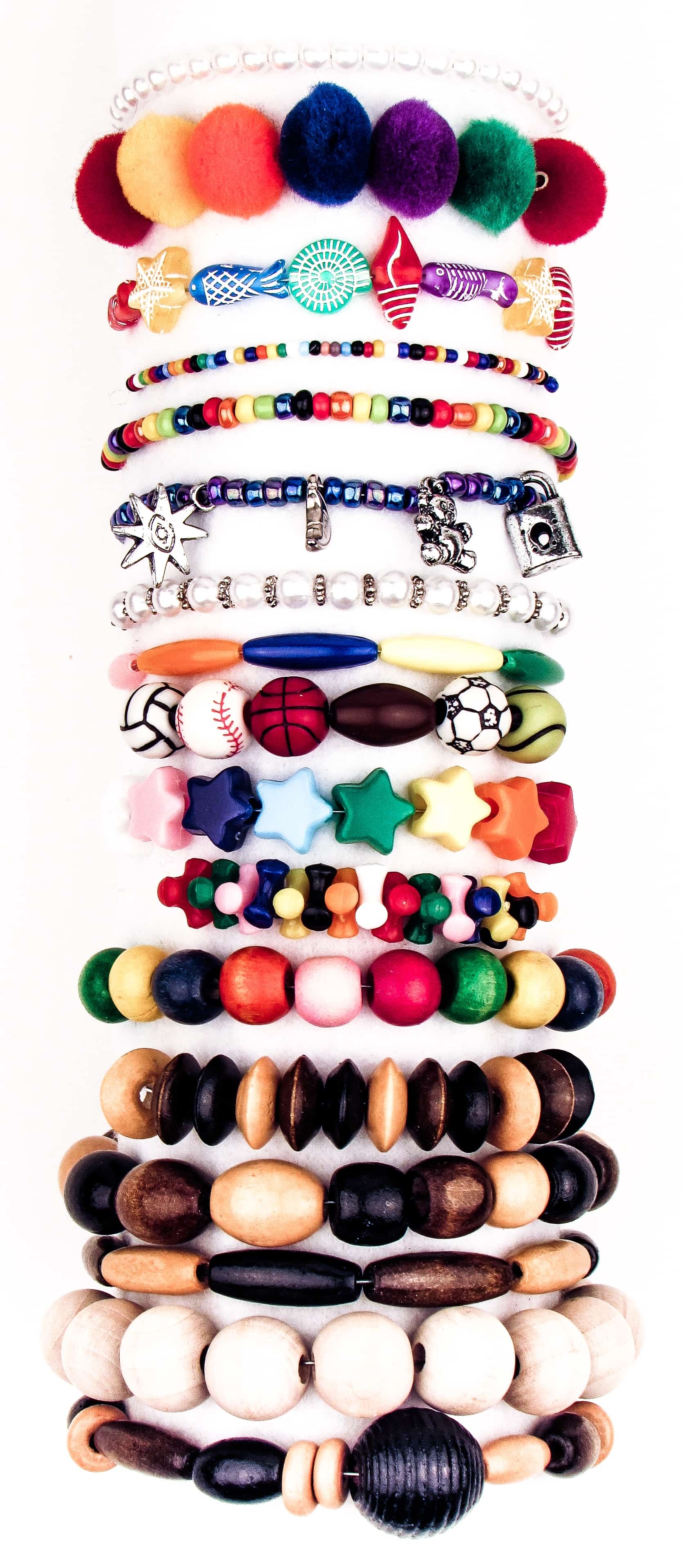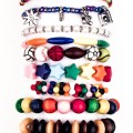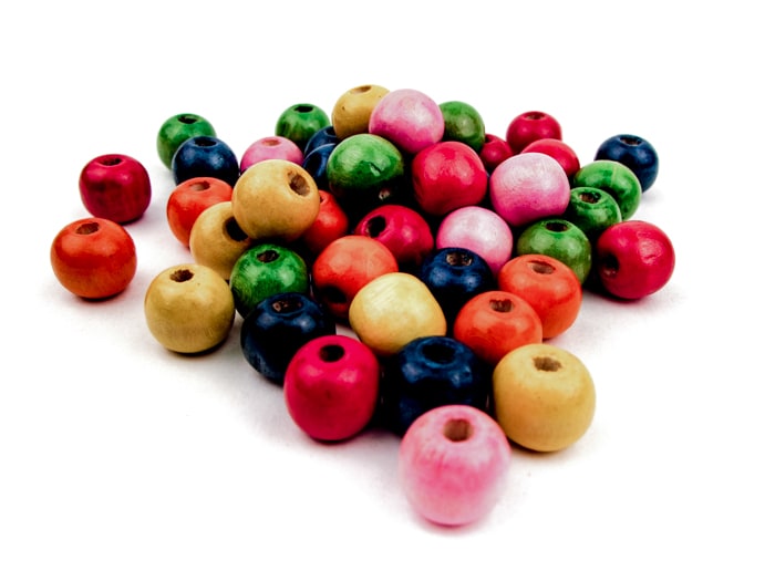 A wide assortment of colours and sizes of wooden beads sold in individual packages. Coloured wood square/140, Natural /40gm